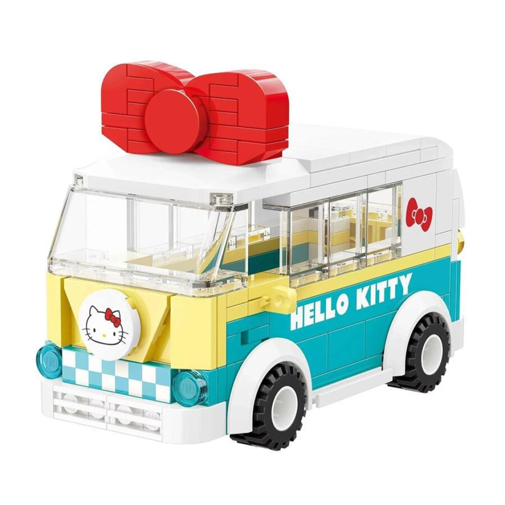This is a Hello Kitty bus building toy model. The bus has a lot of cute Hello Kitty elements, including the logo on the front of the bus and the red bow on the roof. The color of the bus is rich in the style of summer beach. This buildable bus set is a good gift for Hello Kitty fans, and cartoon figure collectors.