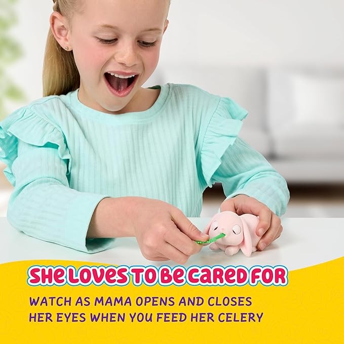Little Live Pets Mama Surprise Minis takes caring for your pet to a whole new level. Experience the joy of nurturing your Mama and watch as she has 2, 3, or 4 surprise baby bunnies! First, make a cozy bed for Mama and the babies with the straw. Fill the water bottle in the hutch and wait. Your child will be amazed as they see the bottle empty and then watch the baby bunnies being revealed! Each baby arrives with its own unique pose and personality, adding to the excitement of discovering which adorable baby pets are joining the family. And the best part? This is a repeat playset, so the surprise and delight of welcoming new babies can happen again and again! Complete the birth certificate to see which babies you discover. The excitement of Mama Surprise Minis never ends!