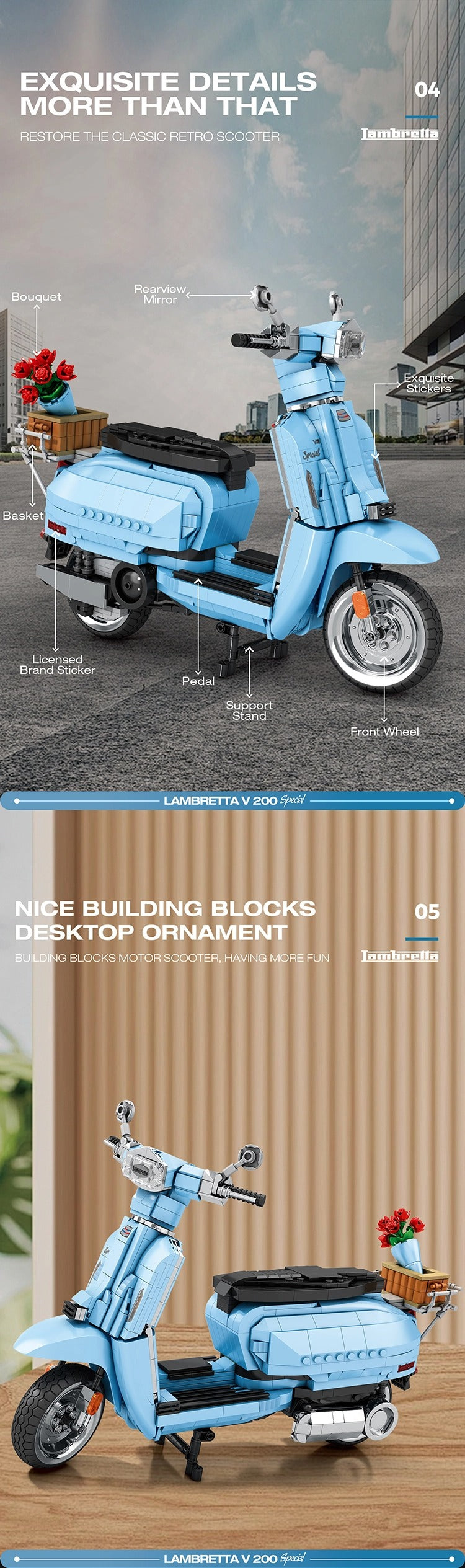 - 【Practical and Beautiful】 The rear of the motorcycle is equipped with a delicate basket and bouquet, adding a touch of romance while also being practical for storing small items. Take your V200 Blue Motorcycle Building Block Toy and embark on a spontaneous adventure!