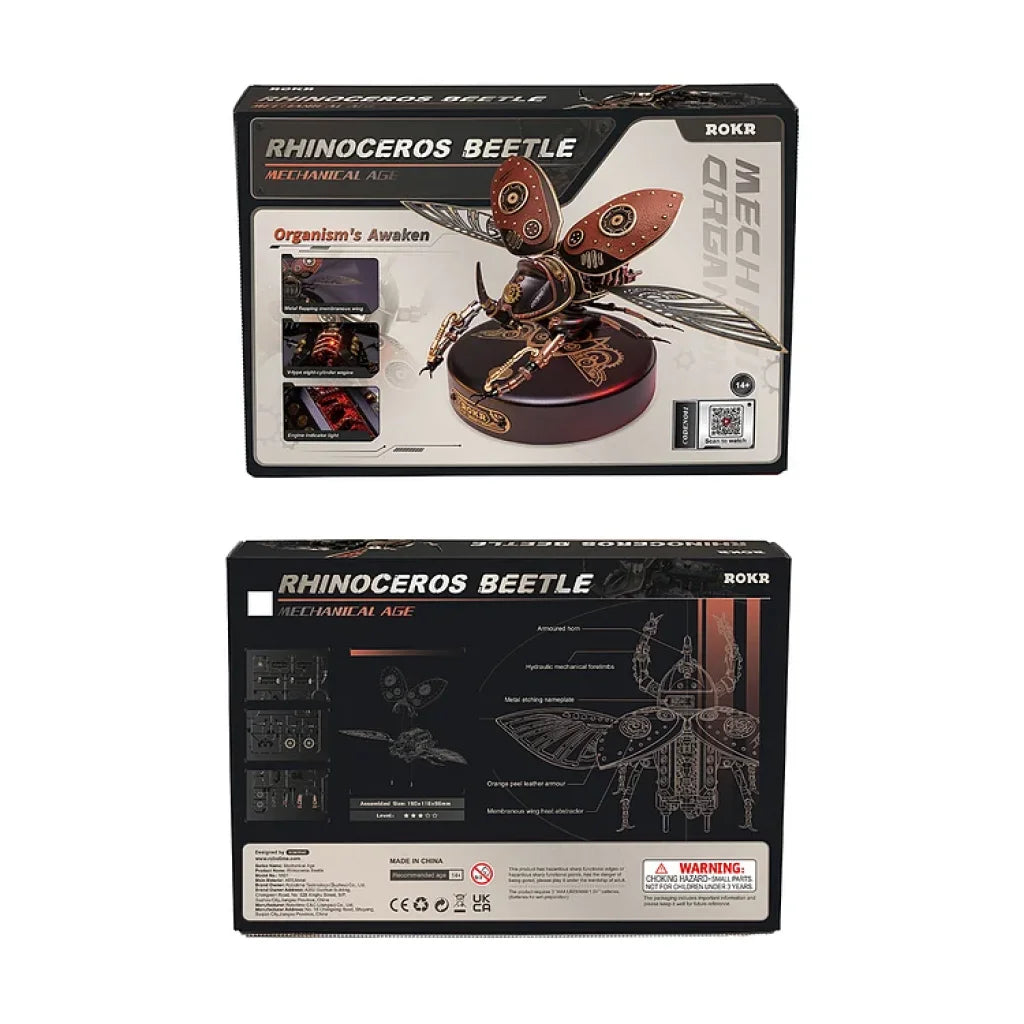 The Rhinoceros Beetle MI01 is the third product of Rokr's DIY Mechanic Organism 3D puzzle Series after the Storm Beetle MI03. Inspired by the real rhinoceros beetle in nature, our designers combined steampunk elements with it to create a highly mechanical aesthetic rhinoceros beetle model while retaining its details, such as the body shape, horn, legs and wings. The main body of the beetle is made of ABS polymer structure material with good impact resistance, the hard wings are covered with leather, and the limbs are made of soft PVC material to protect the model better.