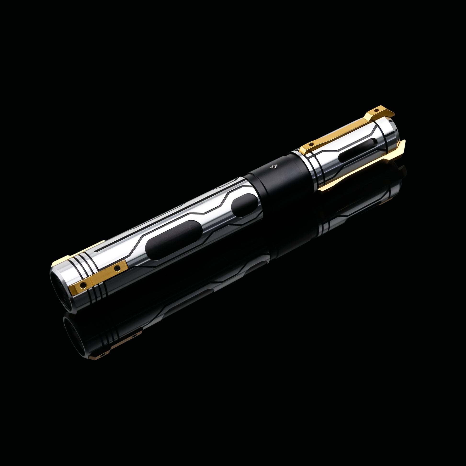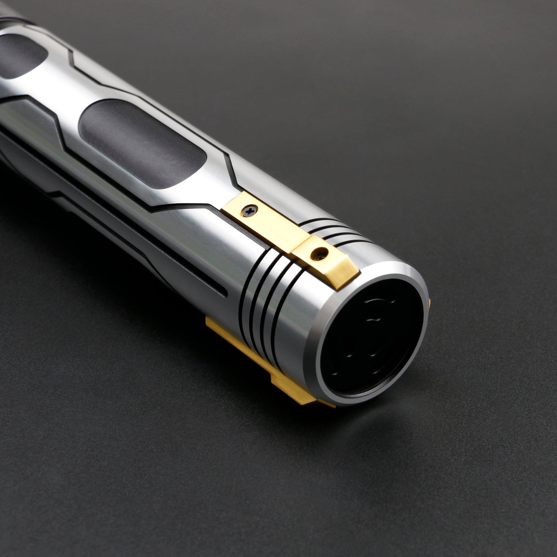 The top of this lightsaber is truly a sight to behold, featuring three large gold pieces of plating and intricately engraved black slots. This exquisite combination of elements transforms the hilt into a visual masterpiece, captivating both the eye and the imagination. The handle, with its matte silver base, seamlessly transitions into a gradient of black engraved lines, adding a touch of sophistication to the overall design.