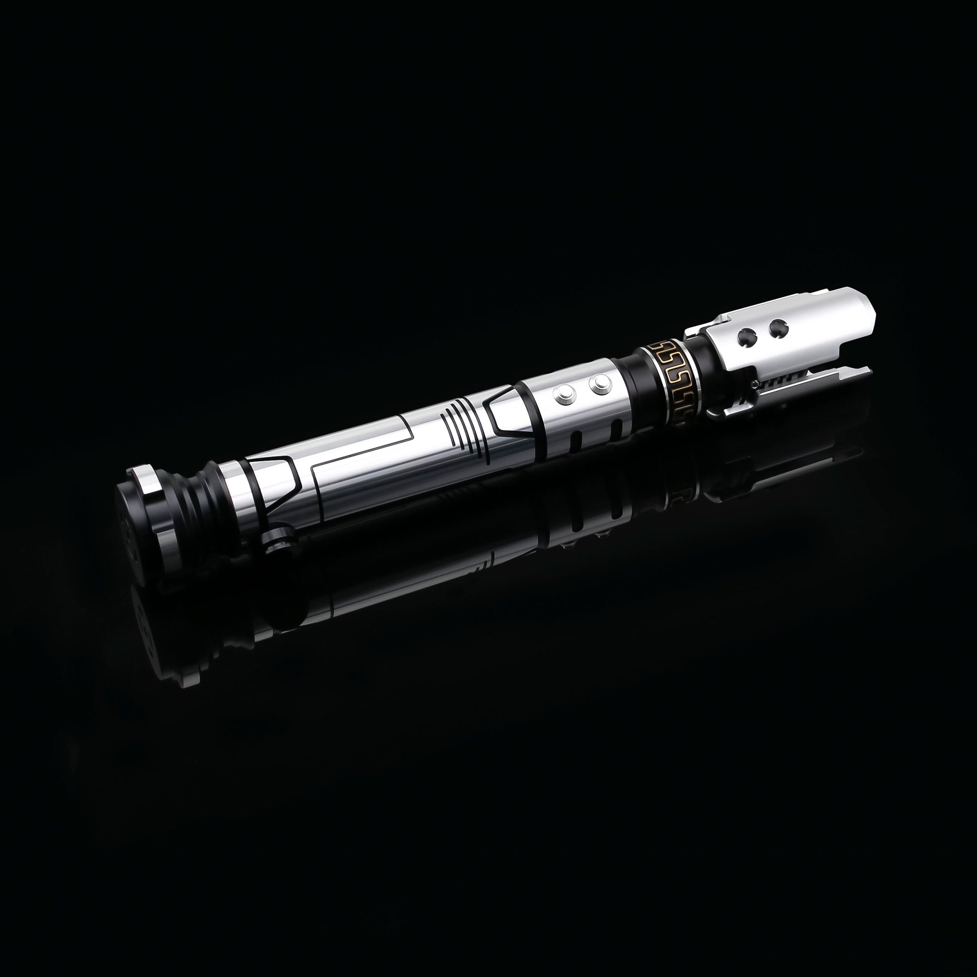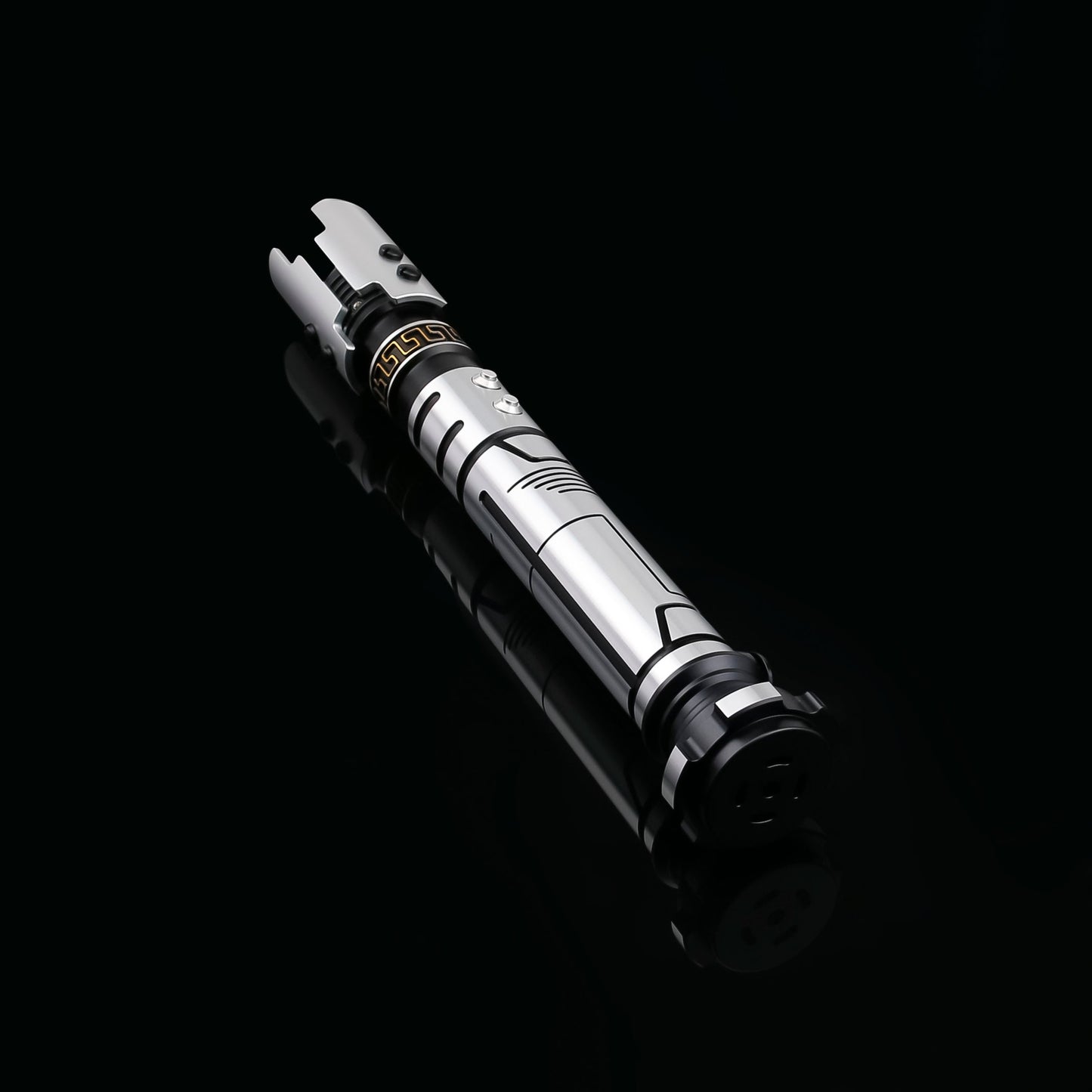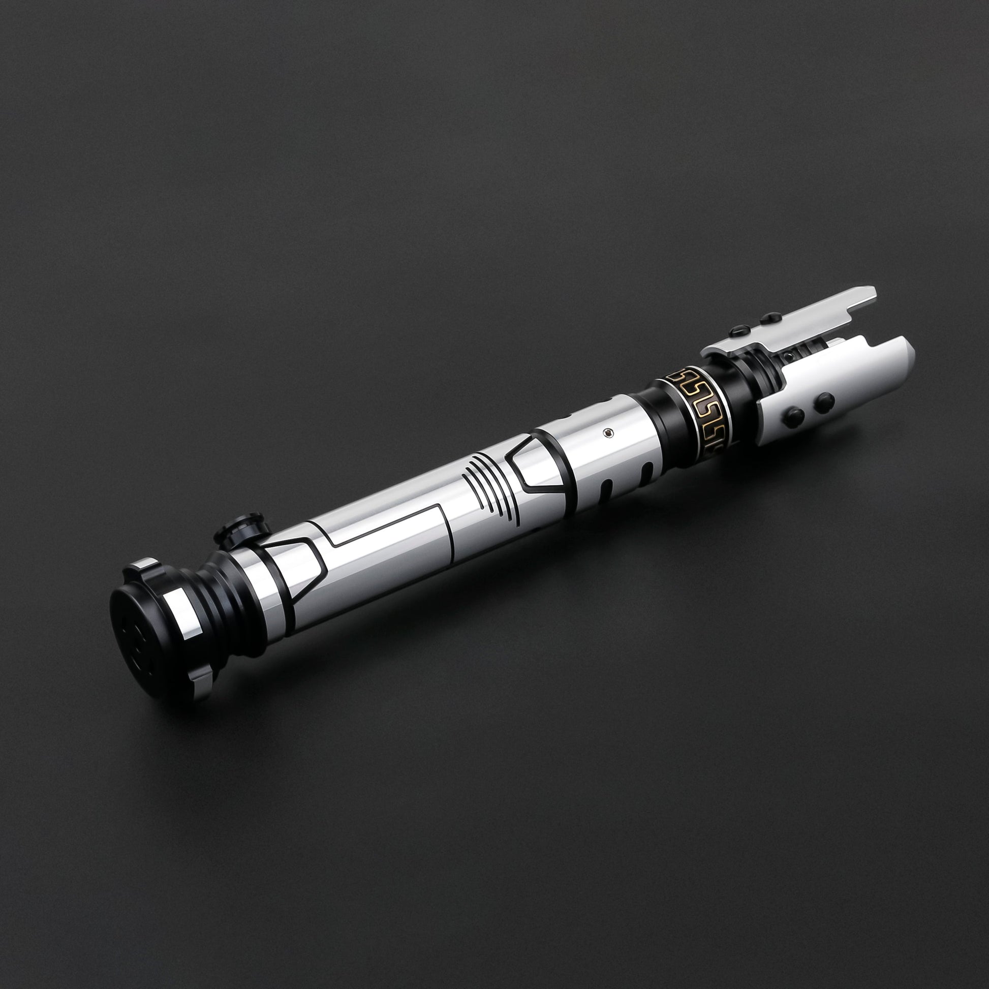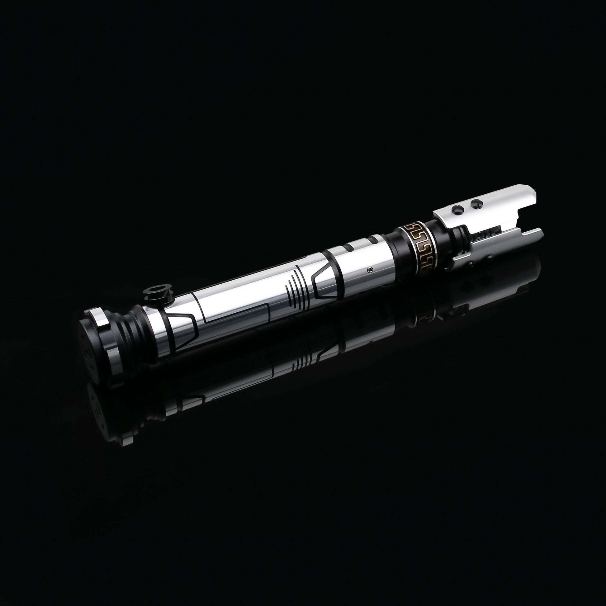 The saber's double-shrouded emitter is a work of art in itself, the exposed sides of the emitter are adorned with three vertical windows, which, when illuminated, bestow upon the saber a captivating and alluring aura. Carefully designed, the recess handle offers not only a comfortable grip but also bears a surface polish that lends it a sleek and technological appearance.