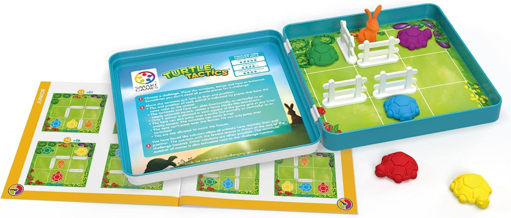 - 1 tin game board which can be used as storage case, 5 tortoises, 1 hare, 4 fences, 1 booklet with 48 challenges and solutions.