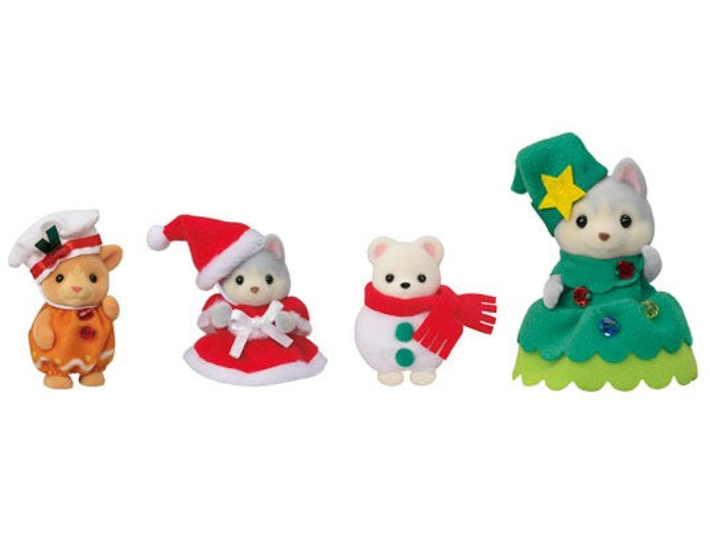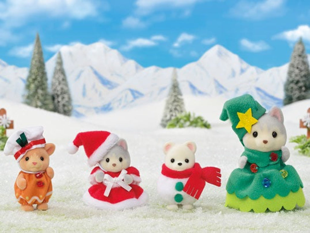Pauline Husky and her baby sister Linnea are off to a party. Pauline has a fantastic green Christmas tree dress, while Linnea is dressed up as Mrs Claus. On the way to the party they also bump into polar bear baby Yana Snowfluff, who has a wonderful snowman costume, while reindeer baby brother Louis Snowdrift is dressed up as a gingerbread man.