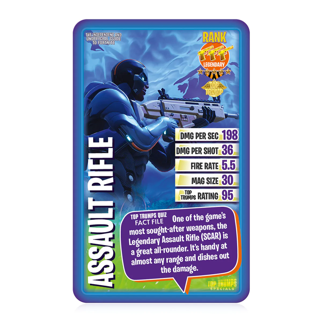 The online game that defined a generation, there’s no denying that Fortnite Battle Royale changed the video game landscape, and paved the way for a whole sub-genre of competitive games. Loved by gamers young and old for its colourful aesthetic and addictive action, gamers can now get their hands on this exciting new edition of Top Trumps - The Independent and Unofficial Guide to Fortnite! Test your knowledge of Fortnite as you deploy your weapon cards according to their strengths, fire off stats in an attempt to outrank your opponents, and loot their cards for your own. You won’t need a hundred players or a parachute to succeed here - just good old fashioned strategy and a bit of luck. Will you use the Assault Rifle for its fearsome damage per second, or the Heavy Sniper Rifle for its immense damage per shot? Maybe you prefer the Minigun for its impressive mag size. Featuring artwork from the franchise, plus fascinating insights into the kinds of weapons Fortnite has to offer, you just might come away with some new ideas for your next match. So deal your cards and get started!